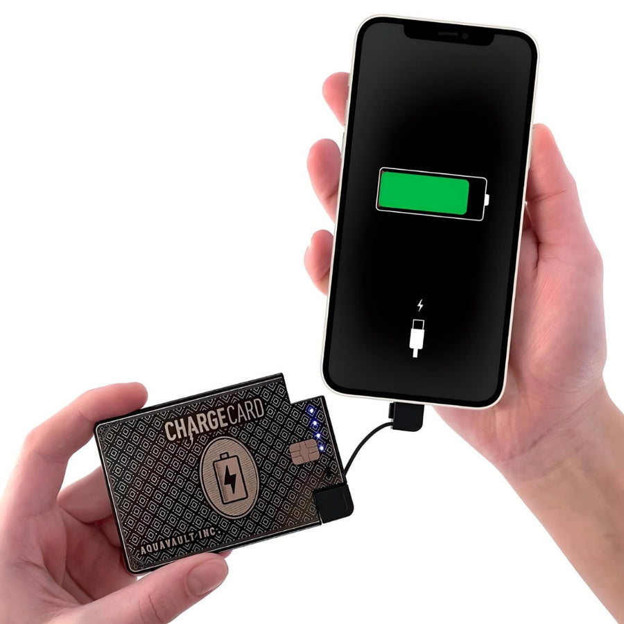 Never let your devices run out of power on the go. The convenient ChargeCard from AquaVault is compact and portable. The fast-charge technology with built-in cables charges iPhones and Androids plus everything from tablets to speakers and more. The credit card size design fits in your wallet so it's there when you need a little extra juice in your device, without bulk.