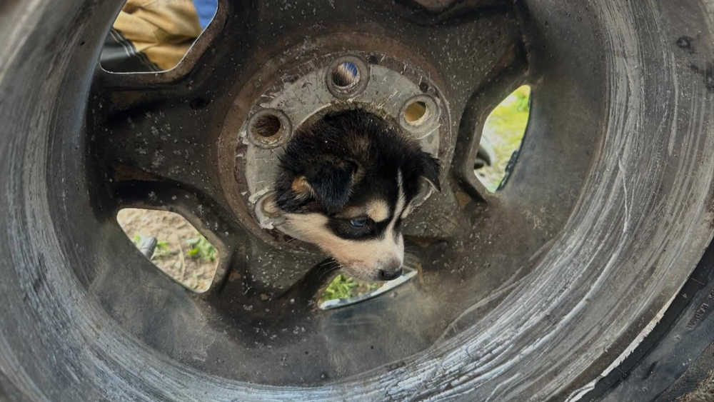 Firefighters used the ladder from their truck to get to the scared dog.