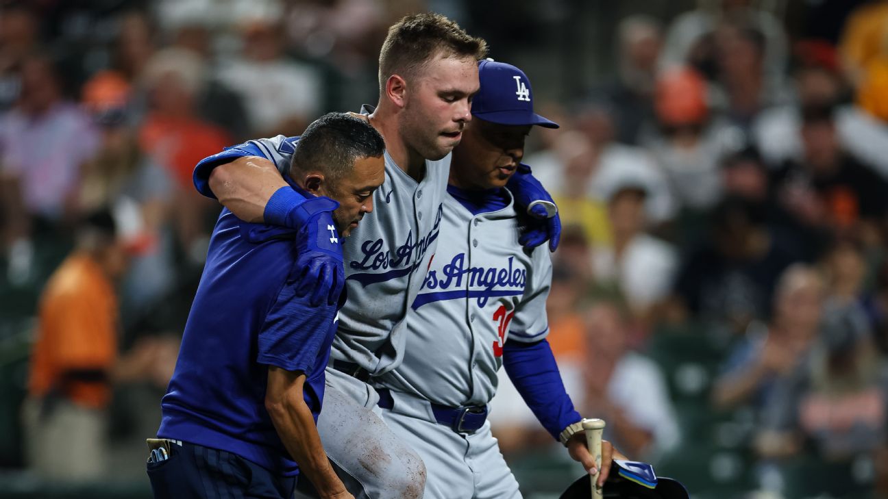 BALTIMORE -- Los Angeles Dodgers catcher Dalton Rushing left Friday's 2-1 loss to the Baltimore Orioles after fouling a pitch off his leg in the top of the sixth inning.
